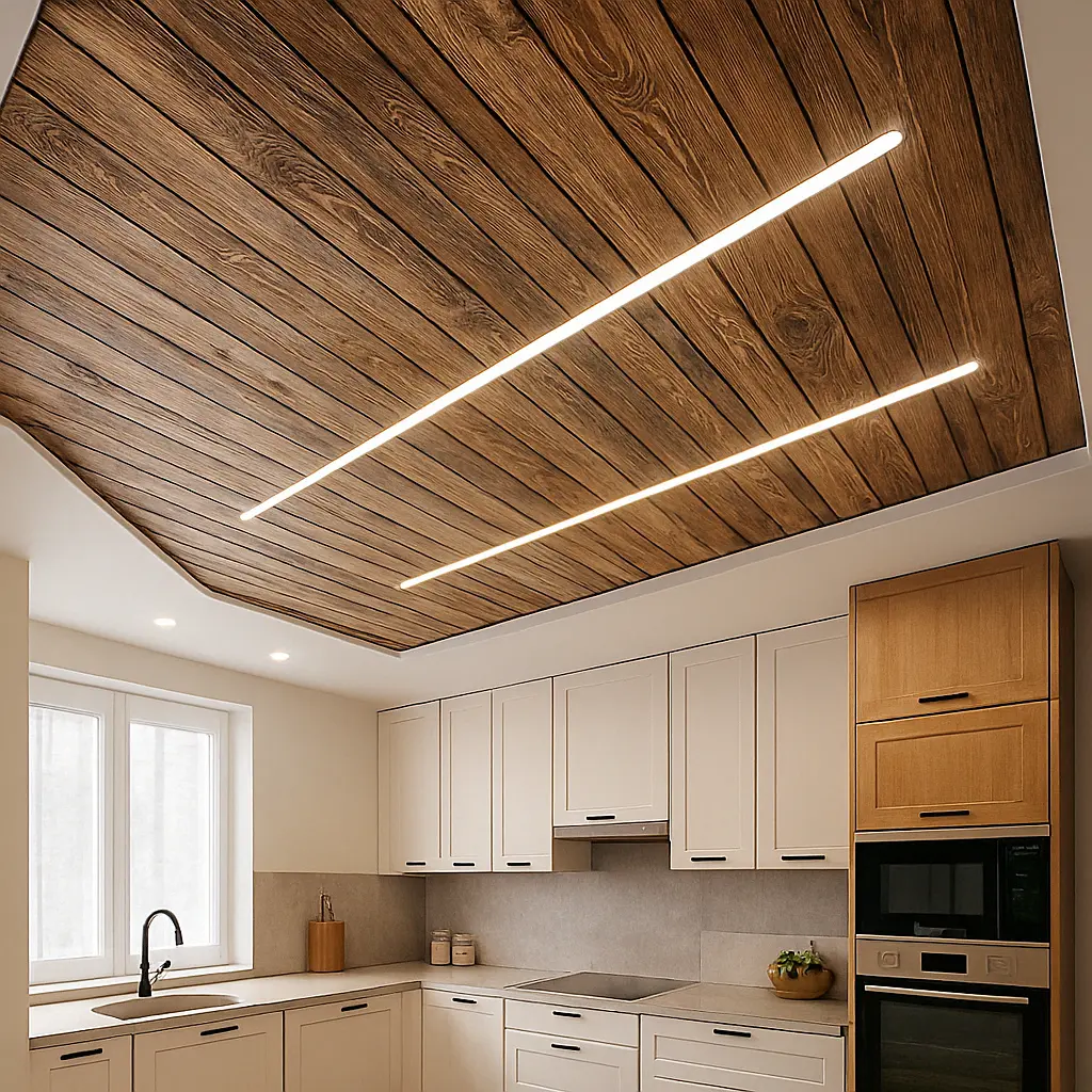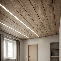 - Теневой профиль даёт чёткую границу между стеной и потолком, создавая аккуратный «тень-эффект» по периметру.